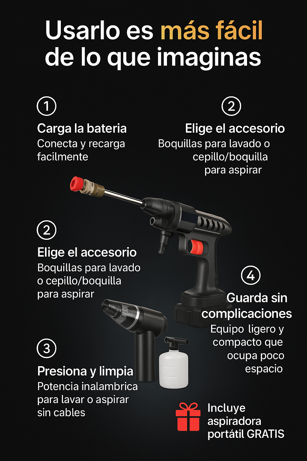 ⚡ Fácil y práctico de usar: diseño ergonómico, boquillas intercambiables y portabilidad total para usar donde quieras.