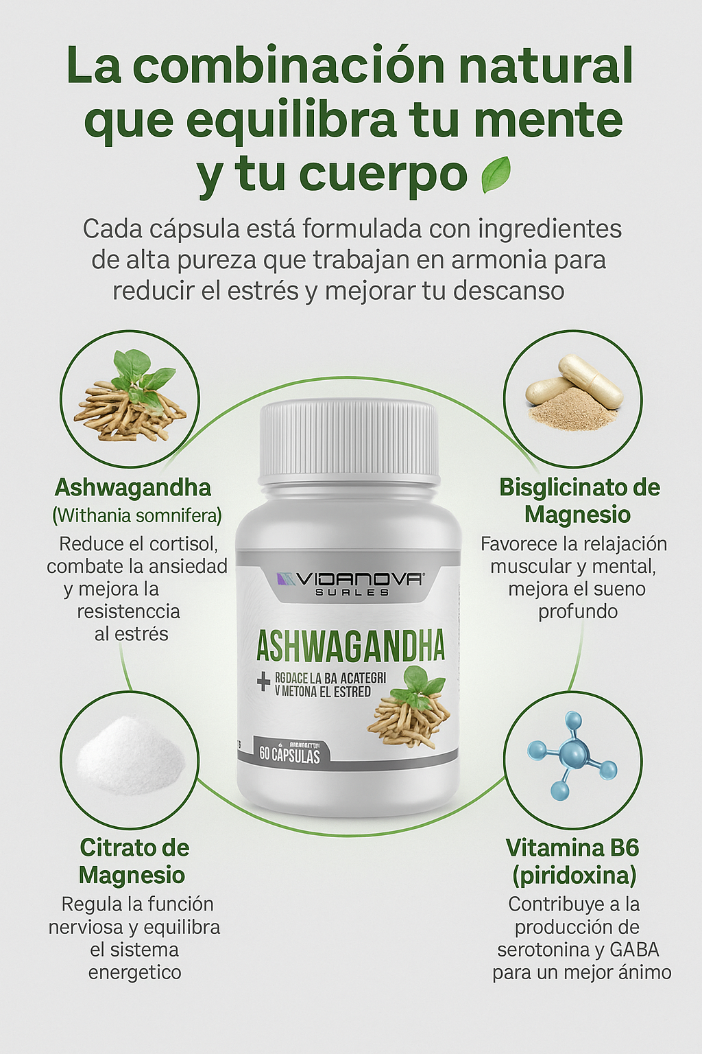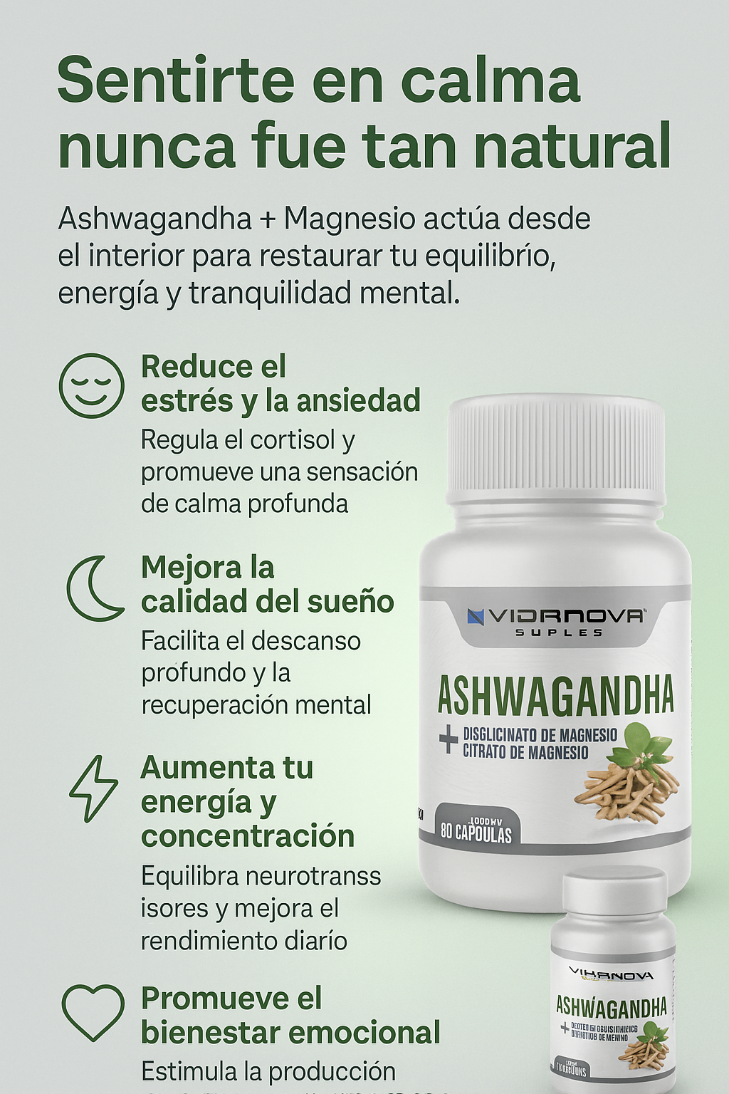 Recupera tu calma interior con Ashwagandha + Magnesio — equilibrio, descanso y energía en una sola fórmula.